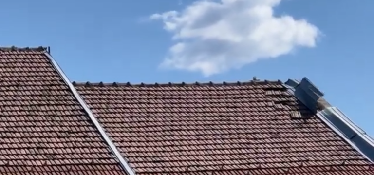 Acoperișul unui bloc din zona centrală este afectat de vântul puternic. O tabla s-a desprins și stă să cadă, la fel ca și țiglele de le acoperiș.