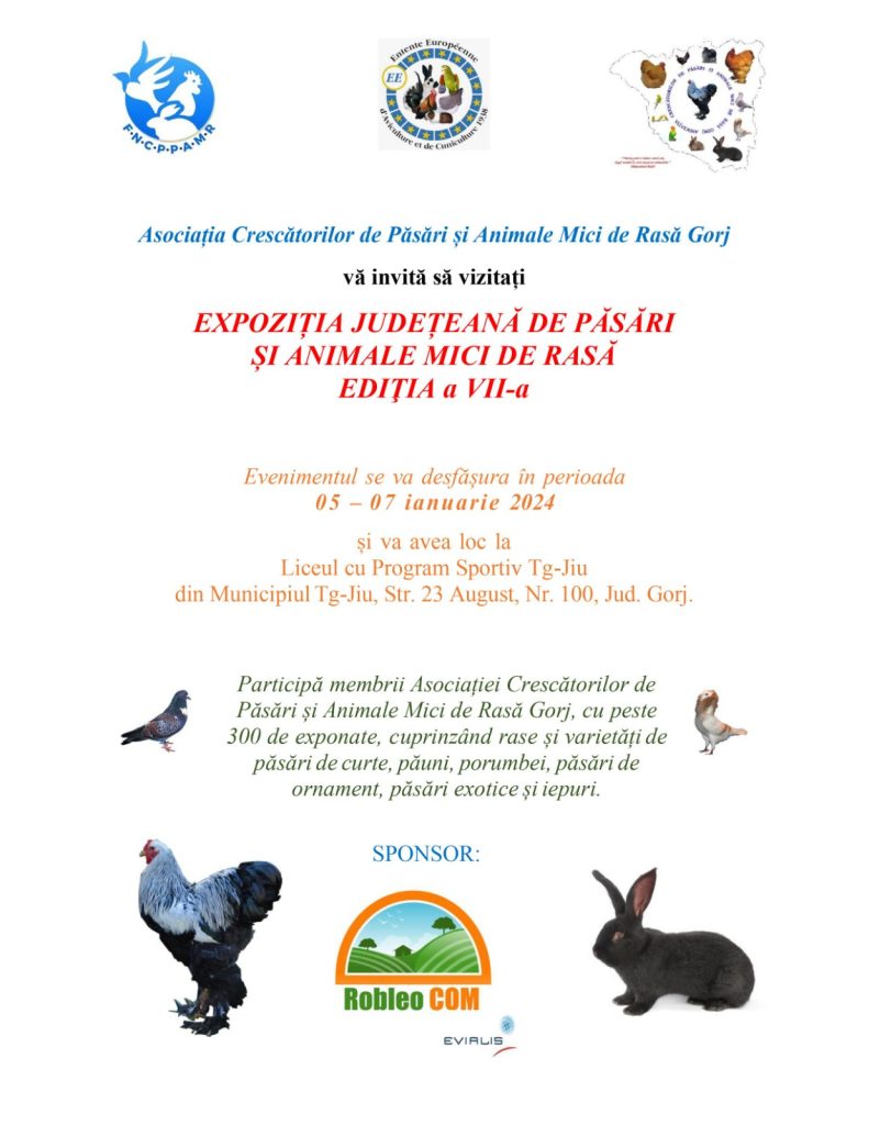 Expoziția Județeană de Păsări și Animale Mici de Rasă se va desfășura în perioada 5-7 ianuarie în incinta Sălii de Sport din cadrul Liceului cu Program Sportiv din municipiul Târgu Jiu.